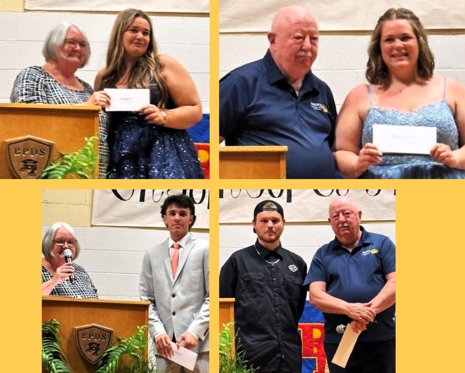 [Photo collage from June 26, 2025 Graduation Ceremony at Bruce Peninsula District School. Top left: Kayleigh Baxter received the Keith Hopkinson Memorial Scholarship (presented by Rotarian Gwen Bestard), an award to a student pursuing post-secondary studies in a medical or health-related field. Kayleigh entered the Psychology / Cognitive Neuroscience program at Western University in London, Ontario this past fall. Top right: Ava Cameron received the Bob Spearing ‘Service Above Self’ Scholarship (presented by Rotarian Doug Embleton), an award which goes to a student whose volunteer activities exemplify the Rotary motto of ‘Service Above Self’. Ava entered the English and Concurrent Education program at Nipissing University this past fall. Bottom left: Jayden Quesnel received the J.C. Buckley Memorial Scholarship (presented by Rotarian Gwen Bestard), which is awarded to a student pursuing post-secondary studies in power engineering, skilled trade or similar technical program. Jayden entered the Electrical Techniques course at Georgian College this past fall. Bottom right: Dylan Munn received the Mary Cameron Award for ‘Most Improved Student’ (presented by Rotarian Doug Embleton). The recipient of this award is selected each year by BPDS.]