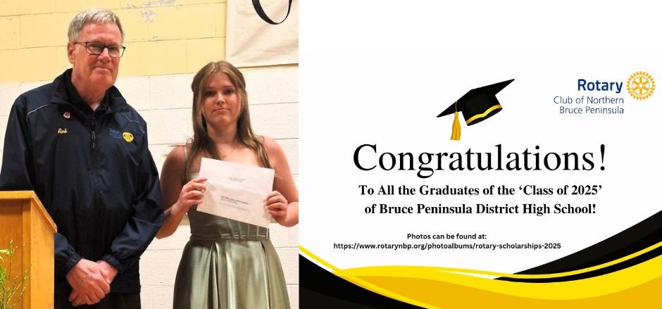 [Photo from June 26, 2025 Graduation Ceremony at Bruce Peninsula District School: Annabelle Galasso received the Rotary ‘Highest Academic Proficiency’ Scholarship (presented by Rotarian Rob Hiscott), having earned the highest Grade 12 average across six 4U/4M courses – this past fall Annabelle entered the Bachelor of Science, Nursing program jointly offered by Western University and Fanshawe College in London, Ontario. Rotary congratulates all the graduates of the Bruce Peninsula District High School Class of 2025 and wishes them well in all future endeavours!