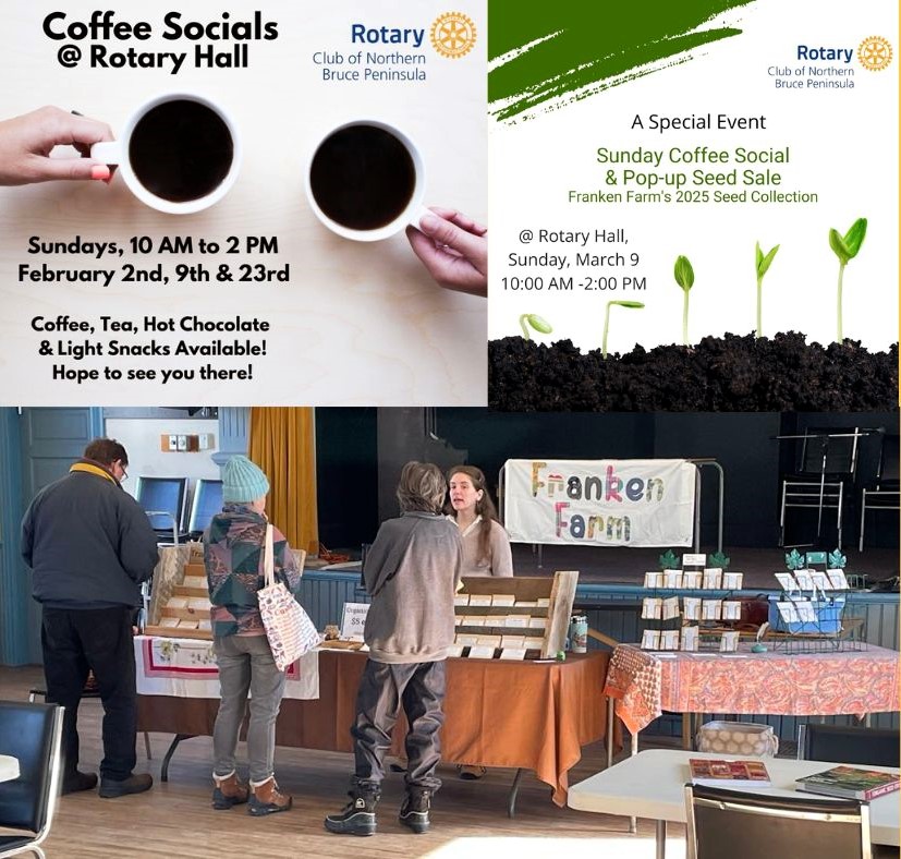For a second year, your local Rotary Club has hosted Sunday Coffee Socials at Rotary Hall (a regular event initially proposed by Rotarian Dan Bryans) during the winter months of the year (January-March) as an opportunity for local community residents to come together in conversation with Rotarians over hot beverages and snacks, including homemade soups. In 2025, there were six Sunday Coffee Socials held, and we experimented further with having pop-up sales during the time of a couple of these socials – Franken Farms made products from their 2025 seed collection available for purchase at Rotary Hall which proved to be very popular!