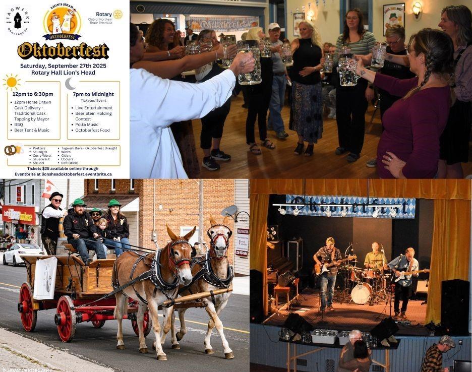 Rotary thanks our sponsoring partner Tagwerk Biers with special thanks to Master Brewer Christian Klaus Reimerschmid von der Heide of Tagwerk Bier! We also thank volunteer Friends of Rotary who helped out throughout the day and evening, making our third annual Oktoberfest a huge success! We thank Cedric and Ashley Scott for providing the wagon drawn by their mules Pearl and Becky to transport the first beer cask to be tapped to open Oktoberfest 2025 at Rotary Hall! And we thank our very generous sponsors of this year’s Oktoberfest which included Tyler Hayes of EPH Tools & Machining Ltd., Ted and Phyllis Hayes of T&P Hayes Investments, and Kyle & Kara Hellyer of Hellyer's Foodland, Lion's Head!
