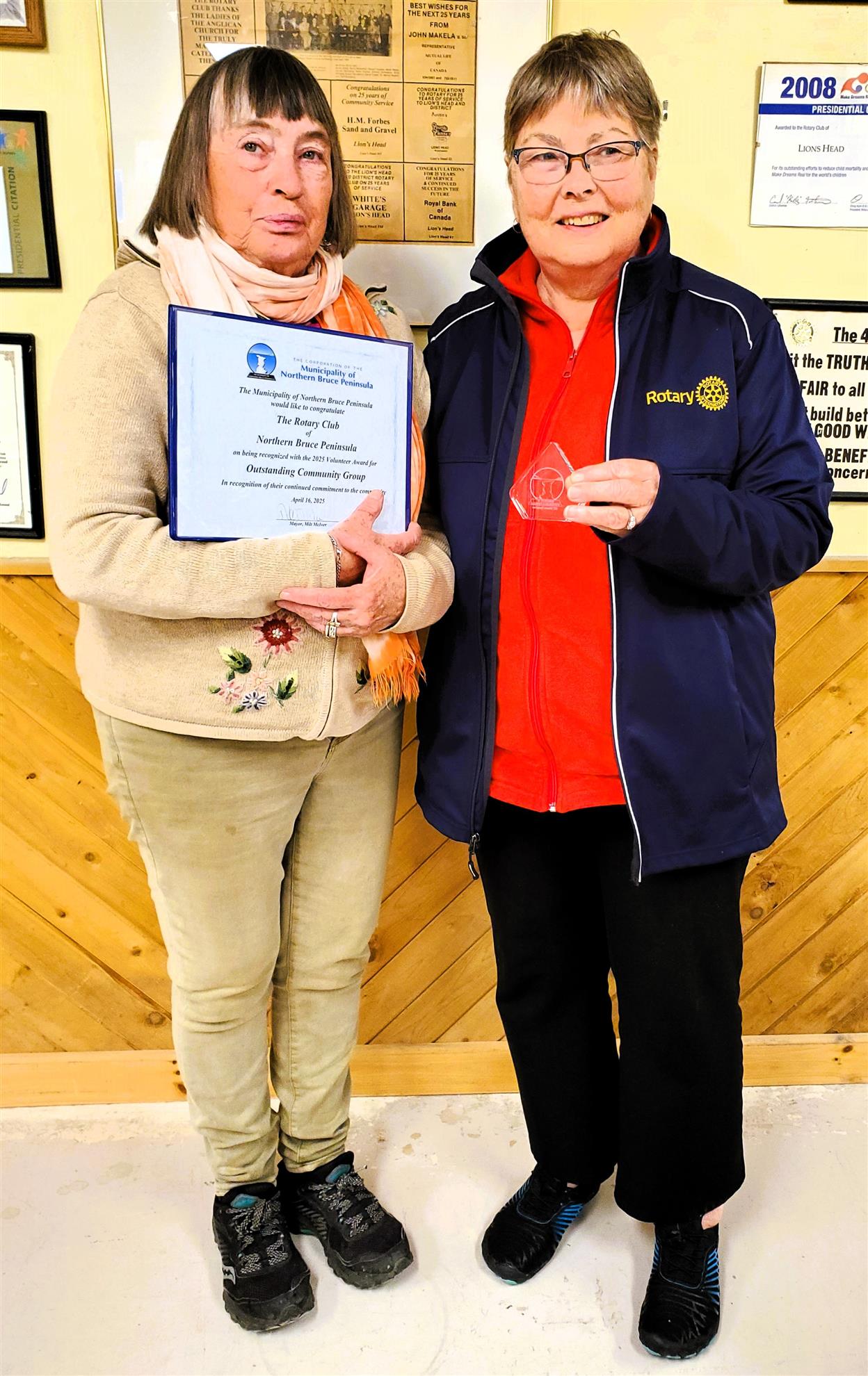 [Photo: Club President Catherine Henderson (left) and Past Club President Cathryn Buckley showing the ‘Outstanding Community Group’ Award received from Mayor Milt McIver at the Municipality of Northern Bruce Peninsula Volunteer Appreciation event held at Rotary Hall on April 16, 2025.]